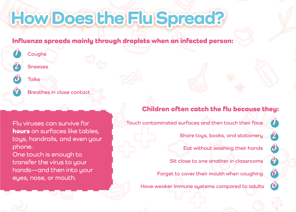 When it comes to children in Malaysia, flu (influenza) is one of the most common illnesses they catch throughout the year. Many parents think the flu is “just a normal fever,” but influenza is actually a viral infection that can spread very quickly—especially in schools, kindergartens, and crowded places. Understanding the types of flu viruses, how they spread, and what symptoms to look out for can help parents protect their children better.