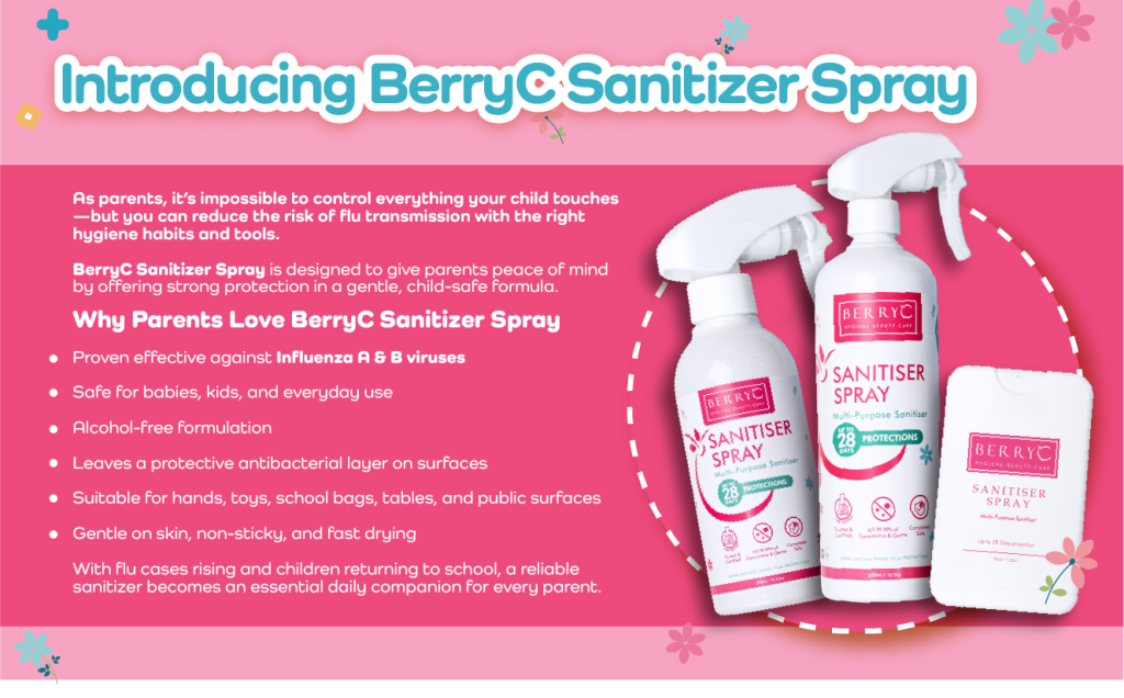 Influenza is common among Malaysian children, but with the right knowledge and habits, parents can greatly reduce the risk of infection. Understanding the virus types, peak seasons, and how flu spreads helps you stay one step ahead. Simple safeguards—like hand hygiene, proper rest, good nutrition, vaccination, and using BerryC Sanitizer Spray—can protect your child and your whole family.