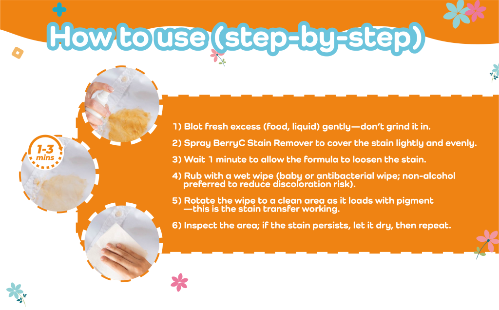 BerryC Stain Remover is a smart, plant-based spot cleaner for organic stains. It works by stain transfer, which means you must spray, wait one minute, and rub with a proper wet wipe so the stain moves from fabric to wipe. It’s not a replacement for laundry or dry cleaning, not a miracle formula that erases every mark, and it has clear limits on dyes, engine oil, and other inorganic stains. Use it quickly after a spill to prevent permanent set-in; expect excellent results on fresh stains and meaningful improvement on old ones (often 80–90%). Choose non-alcohol wet wipes, follow care labels, and finish with a normal wash.