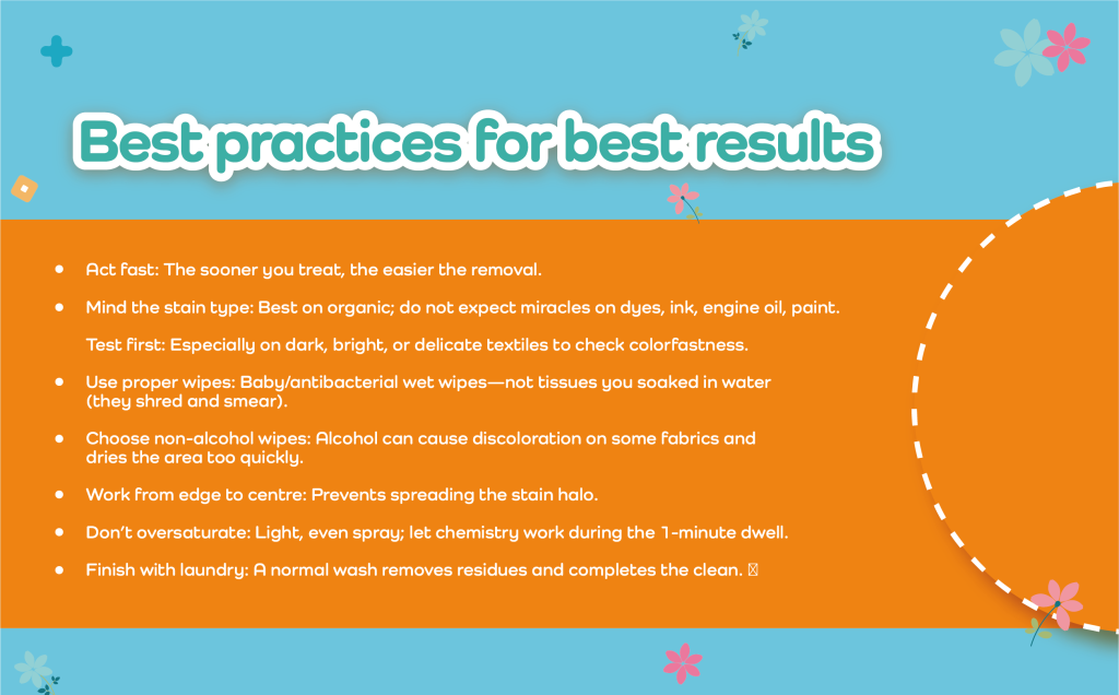 - Correct steps (simple): Spray → wait 1 minute → rub with a wet wipe (baby or antibacterial wipe).