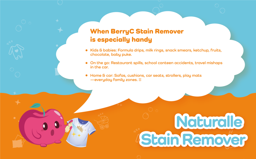 - Scope: BerryC is plant-based and designed for organic stains (food, beverage, body fluids, everyday grime).